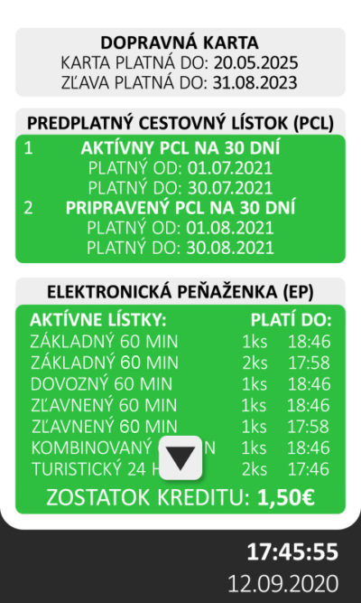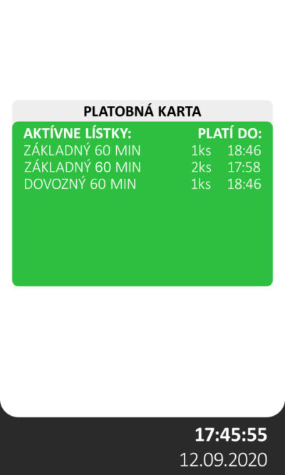 AKTÍVNE LÍSTKY / PLATÍ DO – zoznam typov eCL, počet kusov a čas konca ich platnosti, ktoré boli kúpené prostredníctvom platobnej karty (prípadne iným zariadením s NFC napr. mobilným telefónom alebo smarthodinkami).